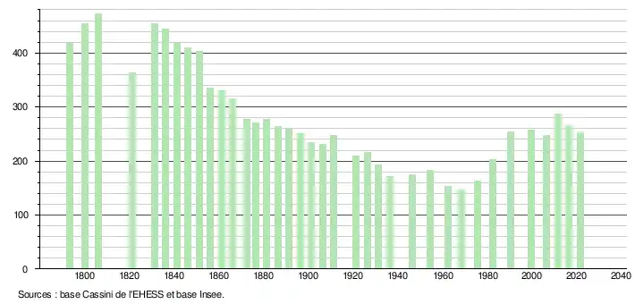 L'évolution du nombre d'habitants est connue à travers les recensements de la population effectués dans la commune depuis 1793. Pour les communes de moins de 10 000 habitants, une enquête de recensement portant sur toute la population est réalisée tous les cinq ans, les populations légales des années intermédiaires étant quant à elles estimées par interpolation ou extrapolation[18]. Pour la commune, le premier recensement exhaustif entrant dans le cadre du nouveau dispositif a été réalisé en 2006[19].
