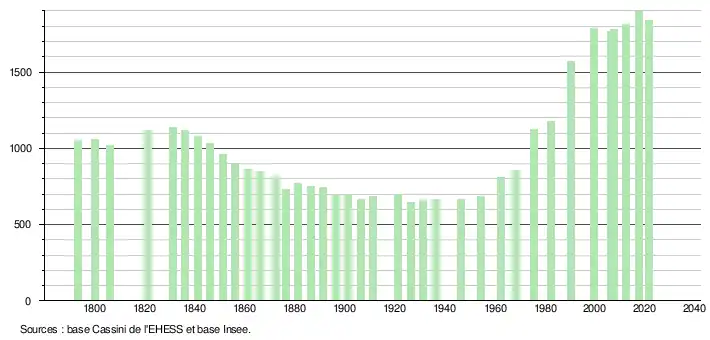 L'évolution du nombre d'habitants est connue à travers les recensements de la population effectués dans la commune depuis 1793. Pour les communes de moins de 10 000 habitants, une enquête de recensement portant sur toute la population est réalisée tous les cinq ans, les populations légales des années intermédiaires étant quant à elles estimées par interpolation ou extrapolation[35]. Pour la commune, le premier recensement exhaustif entrant dans le cadre du nouveau dispositif a été réalisé en 2007[36].