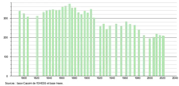 L'évolution du nombre d'habitants est connue à travers les recensements de la population effectués dans la commune depuis 1793. Pour les communes de moins de 10 000 habitants, une enquête de recensement portant sur toute la population est réalisée tous les cinq ans, les populations légales des années intermédiaires étant quant à elles estimées par interpolation ou extrapolation[23]. Pour la commune, le premier recensement exhaustif entrant dans le cadre du nouveau dispositif a été réalisé en 2005[24].