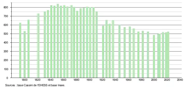 L'évolution du nombre d'habitants est connue à travers les recensements de la population effectués dans la commune depuis 1793. Pour les communes de moins de 10 000 habitants, une enquête de recensement portant sur toute la population est réalisée tous les cinq ans, les populations légales des années intermédiaires étant quant à elles estimées par interpolation ou extrapolation[30]. Pour la commune, le premier recensement exhaustif entrant dans le cadre du nouveau dispositif a été réalisé en 2008[31].