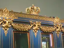 La décoration intérieure est dans le même style, mais encore plus somptueuse que l'extérieur. Ici aussi, les putti dorés et les guirlandes dominent. Le plafond est orné de peintures, dont seule celle du centre est originale. Les petits tableaux ont été volés dans l'après-guerre et remplacés par des copies en 1953. Les originaux ont été réalisés par le peintre de théâtre Rudolf von Seitz, fils du susmentionné Franz von Seitz[23]. Des motifs allégoriques sont représentés : dans le tableau central du grand salon figurent quatre groupes de personnages représentant des enfants dont quatre mariés à l'époque de Louis XIV et un autre montrant les continents connus . Au centre du tableau se trouve le plafonnier, qui symbolise également le soleil[24]. Le tableau central est entouré de quatre plus petits tableaux, dans lesquels des paires de putti représentent l'une des quatre saisons[25]. Le jour et la nuit sont représentés chacun dans une peinture au plafond dans l'armoire de couchage [26].