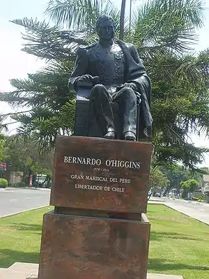 Bernardo O'Higgins Riquelme est un général et chef d’État chilien, né à Chillán le et mort à Lima le . Il est considéré comme l'un des pères de la patrie chilienne car il fut l'une des figures militaires fondamentales de l'indépendance et le premier chef d'État du Chili indépendant. Il dirigea le pays sous le titre de Commandeur Suprême (Director Supremo) entre 1817 et 1823, date à laquelle il se retira volontairement de la présidence afin d'éviter une guerre civile. À la suite de sa démission, il s'exila au Pérou, où il resta jusqu'à sa mort en 1842. Son nom d'origine, Ó hUiginn en gaélique, fut changé en O'Higgins par les Anglais car ils n'arrivaient pas à le prononcer. C'est avec ce patronyme que le père de Bernardo, Ambrosio O'Higgins, originaire d'Irlande, s'installa et se fit connaître au Chili.