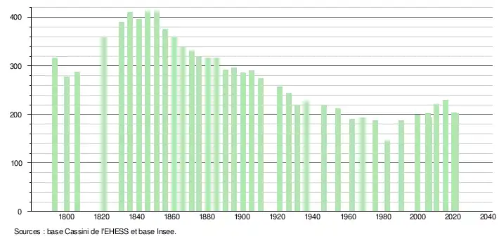 L'évolution du nombre d'habitants est connue à travers les recensements de la population effectués dans la commune depuis 1793. Pour les communes de moins de 10 000 habitants, une enquête de recensement portant sur toute la population est réalisée tous les cinq ans, les populations légales des années intermédiaires étant quant à elles estimées par interpolation ou extrapolation[20]. Pour la commune, le premier recensement exhaustif entrant dans le cadre du nouveau dispositif a été réalisé en 2005[21].