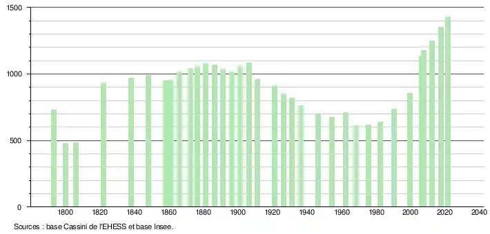 L'évolution du nombre d'habitants est connue à travers les recensements de la population effectués dans la commune depuis 1793. Pour les communes de moins de 10 000 habitants, une enquête de recensement portant sur toute la population est réalisée tous les cinq ans, les populations légales des années intermédiaires étant quant à elles estimées par interpolation ou extrapolation[26]. Pour la commune, le premier recensement exhaustif entrant dans le cadre du nouveau dispositif a été réalisé en 2007[27].