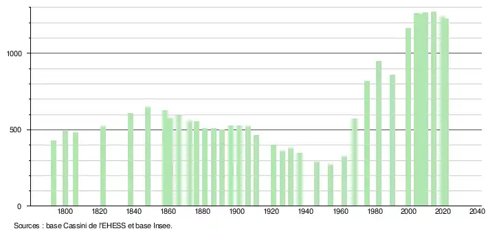 L'évolution du nombre d'habitants est connue à travers les recensements de la population effectués dans la commune depuis 1793. Pour les communes de moins de 10 000 habitants, une enquête de recensement portant sur toute la population est réalisée tous les cinq ans, les populations légales des années intermédiaires étant quant à elles estimées par interpolation ou extrapolation[21]. Pour la commune, le premier recensement exhaustif entrant dans le cadre du nouveau dispositif a été réalisé en 2004[22].