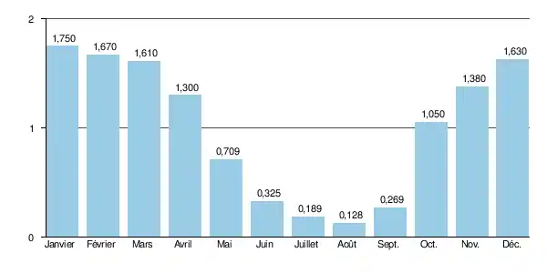Sur cette période d'observation, le débit journalier maximal a été observé le pour 206,0 m3/s. Le débit instantané maximal a été observé le [note 1] avec 748,0 m3/s et la hauteur maximale instantanée de 771 cm le 30 novembre 2014 soit 7,71 m[2].