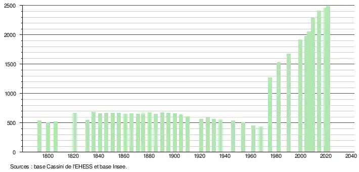 L'évolution du nombre d'habitants est connue à travers les recensements de la population effectués dans la commune depuis 1793. Pour les communes de moins de 10 000 habitants, une enquête de recensement portant sur toute la population est réalisée tous les cinq ans, les populations légales des années intermédiaires étant quant à elles estimées par interpolation ou extrapolation[20]. Pour la commune, le premier recensement exhaustif entrant dans le cadre du nouveau dispositif a été réalisé en 2004[21].