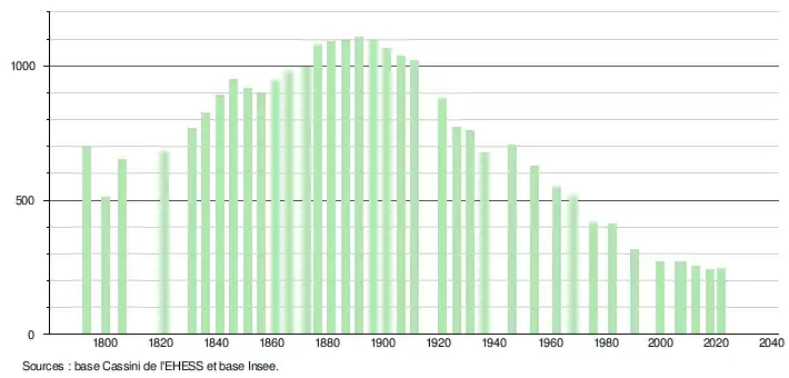 L'évolution du nombre d'habitants est connue à travers les recensements de la population effectués dans la commune depuis 1793. Pour les communes de moins de 10 000 habitants, une enquête de recensement portant sur toute la population est réalisée tous les cinq ans, les populations légales des années intermédiaires étant quant à elles estimées par interpolation ou extrapolation[23]. Pour la commune, le premier recensement exhaustif entrant dans le cadre du nouveau dispositif a été réalisé en 2007[24].