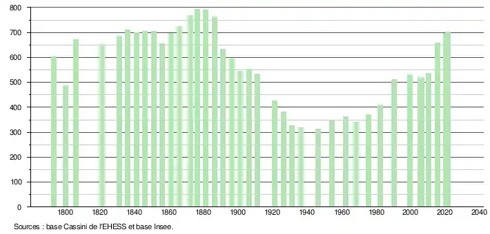 L'évolution du nombre d'habitants est connue à travers les recensements de la population effectués dans la commune depuis 1793. Pour les communes de moins de 10 000 habitants, une enquête de recensement portant sur toute la population est réalisée tous les cinq ans, les populations légales des années intermédiaires étant quant à elles estimées par interpolation ou extrapolation[18]. Pour la commune, le premier recensement exhaustif entrant dans le cadre du nouveau dispositif a été réalisé en 2005[19].