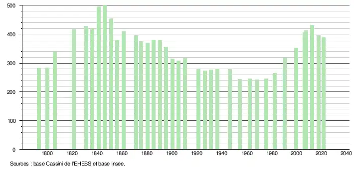 L'évolution du nombre d'habitants est connue à travers les recensements de la population effectués dans la commune depuis 1793. Pour les communes de moins de 10 000 habitants, une enquête de recensement portant sur toute la population est réalisée tous les cinq ans, les populations légales des années intermédiaires étant quant à elles estimées par interpolation ou extrapolation[15]. Pour la commune, le premier recensement exhaustif entrant dans le cadre du nouveau dispositif a été réalisé en 2007[16].