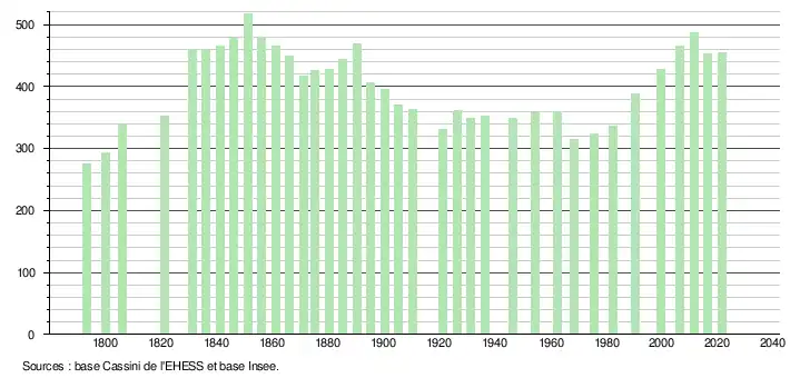 L'évolution du nombre d'habitants est connue à travers les recensements de la population effectués dans la commune depuis 1793. Pour les communes de moins de 10 000 habitants, une enquête de recensement portant sur toute la population est réalisée tous les cinq ans, les populations légales des années intermédiaires étant quant à elles estimées par interpolation ou extrapolation[16]. Pour la commune, le premier recensement exhaustif entrant dans le cadre du nouveau dispositif a été réalisé en 2006[17].