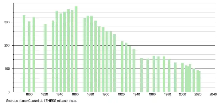 L'évolution du nombre d'habitants est connue à travers les recensements de la population effectués dans la commune depuis 1793. Pour les communes de moins de 10 000 habitants, une enquête de recensement portant sur toute la population est réalisée tous les cinq ans, les populations légales des années intermédiaires étant quant à elles estimées par interpolation ou extrapolation[24]. Pour la commune, le premier recensement exhaustif entrant dans le cadre du nouveau dispositif a été réalisé en 2004[25].
