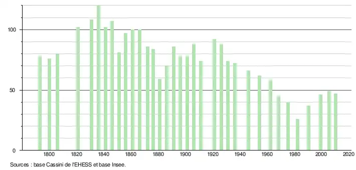 - Dans le tableau des recensements et le graphique, par convention dans Wikipédia, le principe a été retenu, pour les populations légales postérieures à 1999 de n’afficher dans le tableau des recensements et le graphique que les populations correspondant à l'année 2006, première population légale publiée calculée conformément aux concepts définis dans le décret no 2003-485 du 5 juin 2003, et les années correspondant à une enquête exhaustive de recensement pour les communes de moins de 10 000 habitants, ainsi que la dernière population légale publiée par l’Insee.