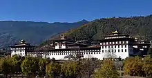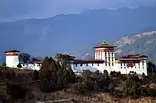 Le bouddhisme y prend racine au VIIe siècle de notre ère. Le roi tibétain Songtsen Gampo (régnant de 627 à 649)[22] se convertit au bouddhisme et étend l'empire tibétain jusqu'au Sikkim et au Bhoutan[23] : il ordonne la construction de deux temples bouddhistes, l'un à Jakar et l'autre à Kyichu (près de Paro, dans la vallée du Paro)[24]. Le bouddhisme se propage véritablement[22] dès 746[25], sous le roi Sindhu Raja (aussi appelé Künjom[26], Sendha Gyab ou Chakhar Gyalpo), un roi indien exilé. Il établit un gouvernement au palais de Chakhar Gutho, dans le district de Bumthang[27],[28]. Le maître et saint indien Padmasambhava (aussi appelé Gourou Rinpoche) arrive en 747[29].