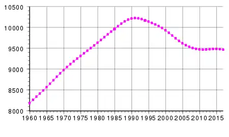 La Biélorussie, peuplée de 9 477 918 habitants[2], connaît une des densités de population les plus faibles du continent : 46 hab/km2. Les Biélorusses vivent majoritairement en milieu urbain ; les plus grandes villes du pays sont Minsk (la capitale), Homiel (ou Gomel), Hrodna, Mahiliow (ou Moguilev), Brest (anciennement Brest-Litovsk), Vitebsk et Babrouïsk.