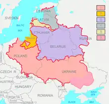 Le traité de Riga, signé le 18 mars 1921 après la guerre soviéto-polonaise, partage le territoire de la Biélorussie en deux : la partie occidentale est attribuée à la Deuxième République de Pologne, et la partie orientale devient la République socialiste soviétique de Biélorussie en 1922, lors de la création de l'Union des républiques socialistes soviétiques.