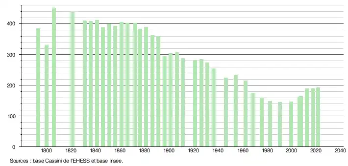 L'évolution du nombre d'habitants est connue à travers les recensements de la population effectués dans la commune depuis 1793. Pour les communes de moins de 10 000 habitants, une enquête de recensement portant sur toute la population est réalisée tous les cinq ans, les populations légales des années intermédiaires étant quant à elles estimées par interpolation ou extrapolation[23]. Pour la commune, le premier recensement exhaustif entrant dans le cadre du nouveau dispositif a été réalisé en 2007[24].
