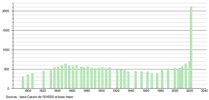 L'évolution du nombre d'habitants est connue à travers les recensements de la population effectués dans la commune depuis 1793. Pour les communes de moins de 10 000 habitants, une enquête de recensement portant sur toute la population est réalisée tous les cinq ans, les populations légales des années intermédiaires étant quant à elles estimées par interpolation ou extrapolation[17]. Pour la commune, le premier recensement exhaustif entrant dans le cadre du nouveau dispositif a été réalisé en 2004[18].