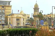Façade de la Bibliothèque nationale d'Alep (à gauche) à côté de la tour horloge de Bab al-Faradj (à droite).
