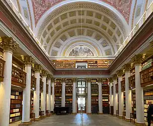 Cependant, le grand incendie de Turku en 1827 détruisit presque entièrement les collections de la bibliothèque : seuls environ 800 volumes prêtés furent sauvés de l'incendie. La collecte des collections a dû recommencer. Une partie importante des livres imprimés en Finlande avant l'incendie provenait des collections du collectionneur de livres Matti Pohto. En 1828, l'université fut transférée de Turku à Helsinki et commença à fonctionner sous le nom d'«Université impériale Alexandre»[15]. En 1832, le bâtiment universitaire conçu par l'architecte Carl Ludvig Engel fut achevé et en 1845, un nouveau bâtiment de bibliothèque fut mis en service sur le côté nord du bâtiment universitaire. Dans les années 1879-1881, le bâtiment de la bibliothèque a été rénové et l'architecte était Frans Sjöström. En 1893, la bibliothèque est dotée d'un éclairage électrique et les horaires d'ouverture peuvent être prolongés. Une grande salle de lecture a été ouverte[15].