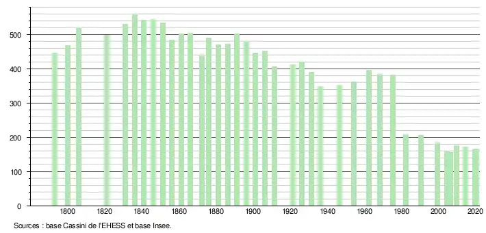L'évolution du nombre d'habitants est connue à travers les recensements de la population effectués dans la commune depuis 1793. Pour les communes de moins de 10 000 habitants, une enquête de recensement portant sur toute la population est réalisée tous les cinq ans, les populations légales des années intermédiaires étant quant à elles estimées par interpolation ou extrapolation[16]. Pour la commune, le premier recensement exhaustif entrant dans le cadre du nouveau dispositif a été réalisé en 2004[17].