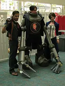 Cosplays de Booker DeWitt et d'Elizabeth, avec entre les deux un Handyman.