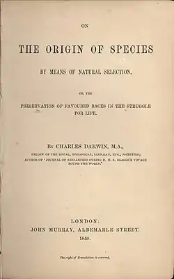 La première théorie de l'évolution du vivant a été avancée par Jean-Baptiste Lamarck dans son ouvrage Philosophie Zoologique en 1809. Comme son titre l'indique, elle se présente sous la forme d'un système philosophique, bien qu'elle pose les bases essentielles pour la compréhension des êtres vivants et de leur évolution. Cinquante ans plus tard, en 1859, avec la parution de L'Origine des espèces[15], Charles Darwin propose une explication scientifique de l'évolution, sous la forme d'un mécanisme simple, avec le principe de sélection naturelle. Avec le temps, la théorie originelle de Darwin a été affinée avec les résultats des expériences et observations que les biologistes ont effectuées. La théorie faisant actuellement consensus est celle de la théorie synthétique de l'évolution, appelée aussi néodarwinisme.