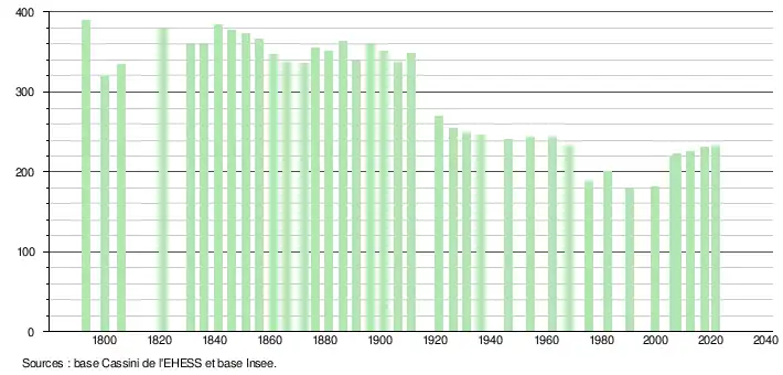 L'évolution du nombre d'habitants est connue à travers les recensements de la population effectués dans la commune depuis 1793. Pour les communes de moins de 10 000 habitants, une enquête de recensement portant sur toute la population est réalisée tous les cinq ans, les populations légales des années intermédiaires étant quant à elles estimées par interpolation ou extrapolation[25]. Pour la commune, le premier recensement exhaustif entrant dans le cadre du nouveau dispositif a été réalisé en 2007[26].