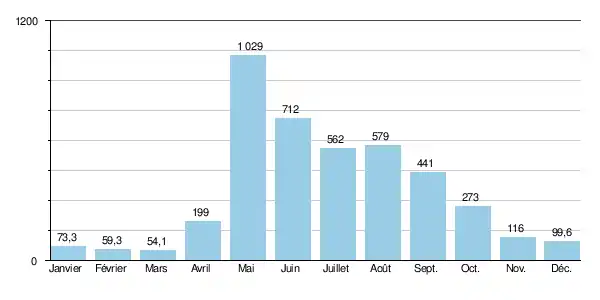 En ne considérant que la période estivale, la seule vraiment importante car libre de glaces (de mai à octobre inclus), le débit mensuel minimal observé a été de 172 m3/s en , ce qui restait fort confortable.