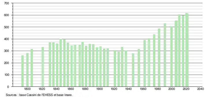 L'évolution du nombre d'habitants est connue à travers les recensements de la population effectués dans la commune depuis 1793. Pour les communes de moins de 10 000 habitants, une enquête de recensement portant sur toute la population est réalisée tous les cinq ans, les populations légales des années intermédiaires étant quant à elles estimées par interpolation ou extrapolation[46]. Pour la commune, le premier recensement exhaustif entrant dans le cadre du nouveau dispositif a été réalisé en 2005[47].