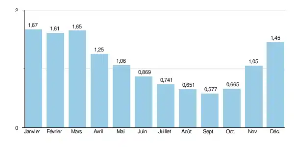 Son débit moyen interannuel que l'on appelle aussi module est de 1,1 m3/s.