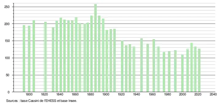 L'évolution du nombre d'habitants est connue à travers les recensements de la population effectués dans la commune depuis 1793. Pour les communes de moins de 10 000 habitants, une enquête de recensement portant sur toute la population est réalisée tous les cinq ans, les populations légales des années intermédiaires étant quant à elles estimées par interpolation ou extrapolation[13]. Pour la commune, le premier recensement exhaustif entrant dans le cadre du nouveau dispositif a été réalisé en 2006[14].