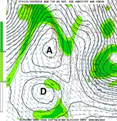 • la première zone s'étend à l'ouest du bloc. L'air venant d'ouest est forcé de descendre vers l'équateur autour de la première dépression coupée, ce qui donne une forte advection d'air froid venu des pôles dans celle-ci ;