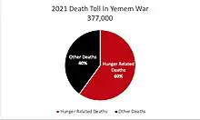 L'ONU estime qu'à la fin de 2021, le conflit au Yémen a coûté la vie à plus de 377 000 personnes, dont 60 % sont mortes en raison de problèmes associés au conflit, tels que la famine et les maladies évitables[21],[22]. En mars 2022, plus de 17 millions de personnes au Yémen connaissent des niveaux élevés d'insécurité alimentaire aiguë[23].