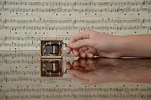 - un clavier fixé devant le cylindre est l'élément musical de l'instrument ; il est constitué d'un ensemble de lames d'acier parfaitement accordées suivant l'air à jouer, et qui soulevées puis lâchées par les picots du cylindre, vont vibrer en produisant le son ;