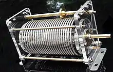 Le variomètre est un type de bobine à air à variation continue. Il s'agit de deux bobines avec le même nombre de tours connectées en série, l'une dans l'autre. La bobine intérieure est montée sur un arbre de sorte que son axe puisse être tourné par rapport à la bobine extérieure. Lorsque les axes des deux bobines sont colinéaires, avec les champs magnétiques orientés dans la même direction, les champs s'additionnent et l'inductance est maximale. Lorsque la bobine intérieure est tournée de manière que son axe fasse un angle avec la bobine extérieure, l'inductance mutuelle entre elles est plus faible et l'inductance totale est donc inférieure. Lorsque la bobine intérieure est tournée de 180° de façon que les bobines soient colinéaires avec leurs champs magnétiques opposés, les deux champs s'annulent et l'inductance est très faible. Ce type a l'avantage d'être continuellement variable sur une large gamme. Il est utilisé dans les adaptateurs d'antenne et les circuits d'adaptation pour adapter les émetteurs basse fréquence à leurs antennes.