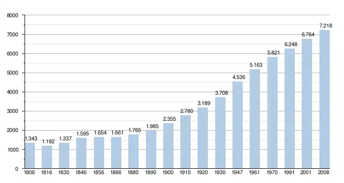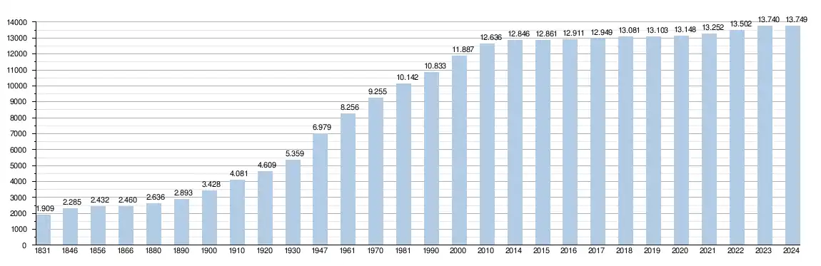 - Source : DGS - Remarque: 1831 jusqu'à 1981=recensement; depuis 1990=nombre d'habitants chaque 1er janvier[5]