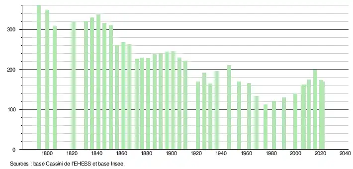 L'évolution du nombre d'habitants est connue à travers les recensements de la population effectués dans la commune depuis 1793. Pour les communes de moins de 10 000 habitants, une enquête de recensement portant sur toute la population est réalisée tous les cinq ans, les populations légales des années intermédiaires étant quant à elles estimées par interpolation ou extrapolation[21]. Pour la commune, le premier recensement exhaustif entrant dans le cadre du nouveau dispositif a été réalisé en 2005[22].