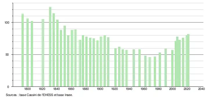 L'évolution du nombre d'habitants est connue à travers les recensements de la population effectués dans la commune depuis 1793. Pour les communes de moins de 10 000 habitants, une enquête de recensement portant sur toute la population est réalisée tous les cinq ans, les populations légales des années intermédiaires étant quant à elles estimées par interpolation ou extrapolation[49]. Pour la commune, le premier recensement exhaustif entrant dans le cadre du nouveau dispositif a été réalisé en 2004[50].