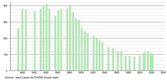L'évolution du nombre d'habitants est connue à travers les recensements de la population effectués dans la commune depuis 1793. Pour les communes de moins de 10 000 habitants, une enquête de recensement portant sur toute la population est réalisée tous les cinq ans, les populations légales des années intermédiaires étant quant à elles estimées par interpolation ou extrapolation[17]. Pour la commune, le premier recensement exhaustif entrant dans le cadre du nouveau dispositif a été réalisé en 2008[18].