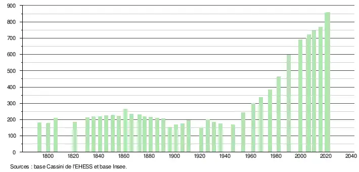 L'évolution du nombre d'habitants est connue à travers les recensements de la population effectués dans la commune depuis 1793. Pour les communes de moins de 10 000 habitants, une enquête de recensement portant sur toute la population est réalisée tous les cinq ans, les populations légales des années intermédiaires étant quant à elles estimées par interpolation ou extrapolation[28]. Pour la commune, le premier recensement exhaustif entrant dans le cadre du nouveau dispositif a été réalisé en 2005[29].