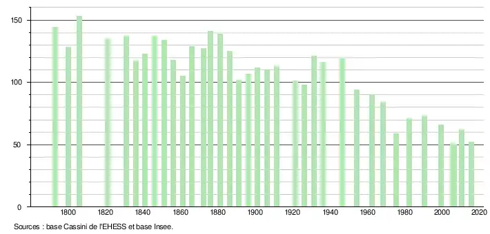 L'évolution du nombre d'habitants est connue à travers les recensements de la population effectués dans la commune depuis 1793. Pour les communes de moins de 10 000 habitants, une enquête de recensement portant sur toute la population est réalisée tous les cinq ans, les populations légales des années intermédiaires étant quant à elles estimées par interpolation ou extrapolation[3]. Pour la commune, le premier recensement exhaustif entrant dans le cadre du nouveau dispositif a été réalisé en 2005[4].
