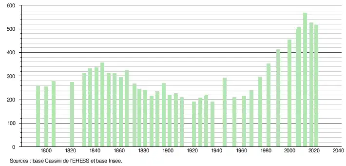 L'évolution du nombre d'habitants est connue à travers les recensements de la population effectués dans la commune depuis 1793. Pour les communes de moins de 10 000 habitants, une enquête de recensement portant sur toute la population est réalisée tous les cinq ans, les populations légales des années intermédiaires étant quant à elles estimées par interpolation ou extrapolation[31]. Pour la commune, le premier recensement exhaustif entrant dans le cadre du nouveau dispositif a été réalisé en 2007[32].