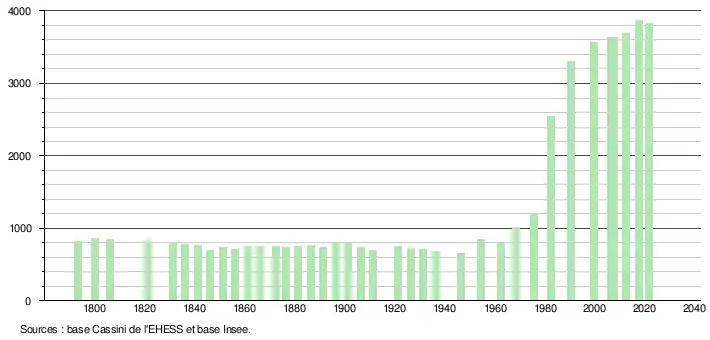 L'évolution du nombre d'habitants est connue à travers les recensements de la population effectués dans la commune depuis 1793. Pour les communes de moins de 10 000 habitants, une enquête de recensement portant sur toute la population est réalisée tous les cinq ans, les populations légales des années intermédiaires étant quant à elles estimées par interpolation ou extrapolation[34]. Pour la commune, le premier recensement exhaustif entrant dans le cadre du nouveau dispositif a été réalisé en 2007[35].