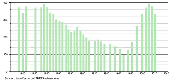 L'évolution du nombre d'habitants est connue à travers les recensements de la population effectués dans la commune depuis 1793. Pour les communes de moins de 10 000 habitants, une enquête de recensement portant sur toute la population est réalisée tous les cinq ans, les populations légales des années intermédiaires étant quant à elles estimées par interpolation ou extrapolation[41]. Pour la commune, le premier recensement exhaustif entrant dans le cadre du nouveau dispositif a été réalisé en 2005[42].