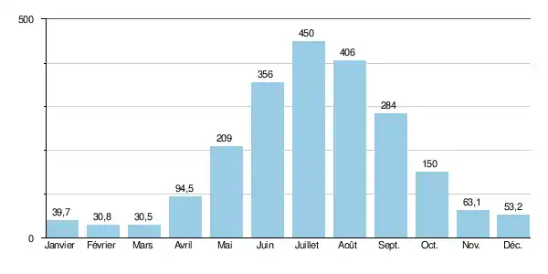 En considérant la seule période estivale, libre de glaces (de mai à octobre inclus), le débit mensuel minimal observé a été de 112 m3/s en , ce qui restait franchement abondant.