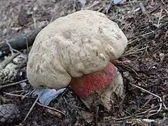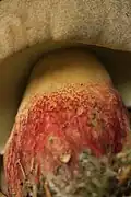 Son stipe est jaune dans la partie supérieure et rouge en dessous, mais il est parfois complètement rougeâtre. La partie supérieure est couverte d'un réseau saillant de couleur blanche[25],[27]. Il mesure 7 à 15 cm de long sur 2 à 5 cm de large. Il peut être plus épais à la base ou avoir une largeur constante[28]. Parfois, chez les champignons matures ou les spécimens récoltés depuis quelques jours, la couleur du stipe rougeâtre disparaît complètement et est remplacée par des tons ocre brun[29]. La chair jaune pâle bleuit lorsqu'elle est blessée, la décoloration s'étalant à partir de la zone endommagée[30]. Son odeur peut être forte et a été comparée à l'encre[31].