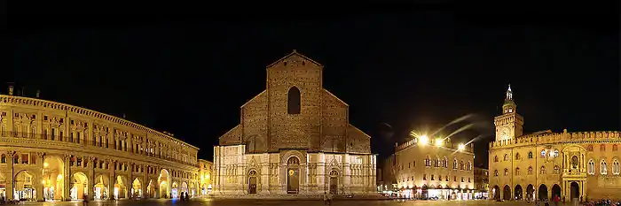 - La Piazza Maggiore est la principale place de la ville dont la forme actuelle date du XVe siècle. Cette place contient les principaux bâtiments médiévaux de la Ville. En effet, le Palazzo d’Accursio, la Basilique San Petronio, le Palais des Notaires, le Palazzo del Podestà et le Palazzo dei Banchi donnent sur cette place. La place est adjacente à une autre place remarquable de la ville, la Piazza Nettuno.