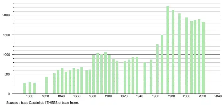 L'évolution du nombre d'habitants est connue à travers les recensements de la population effectués dans la commune depuis 1793. Pour les communes de moins de 10 000 habitants, une enquête de recensement portant sur toute la population est réalisée tous les cinq ans, les populations légales des années intermédiaires étant quant à elles estimées par interpolation ou extrapolation[21]. Pour la commune, le premier recensement exhaustif entrant dans le cadre du nouveau dispositif a été réalisé en 2005[22].