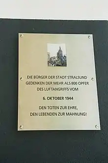 - (de) Cet article est partiellement ou en totalité issu de l’article de Wikipédia en allemand intitulé « Bombenangriff auf Stralsund am 6. Oktober 1944 » (voir la liste des auteurs).